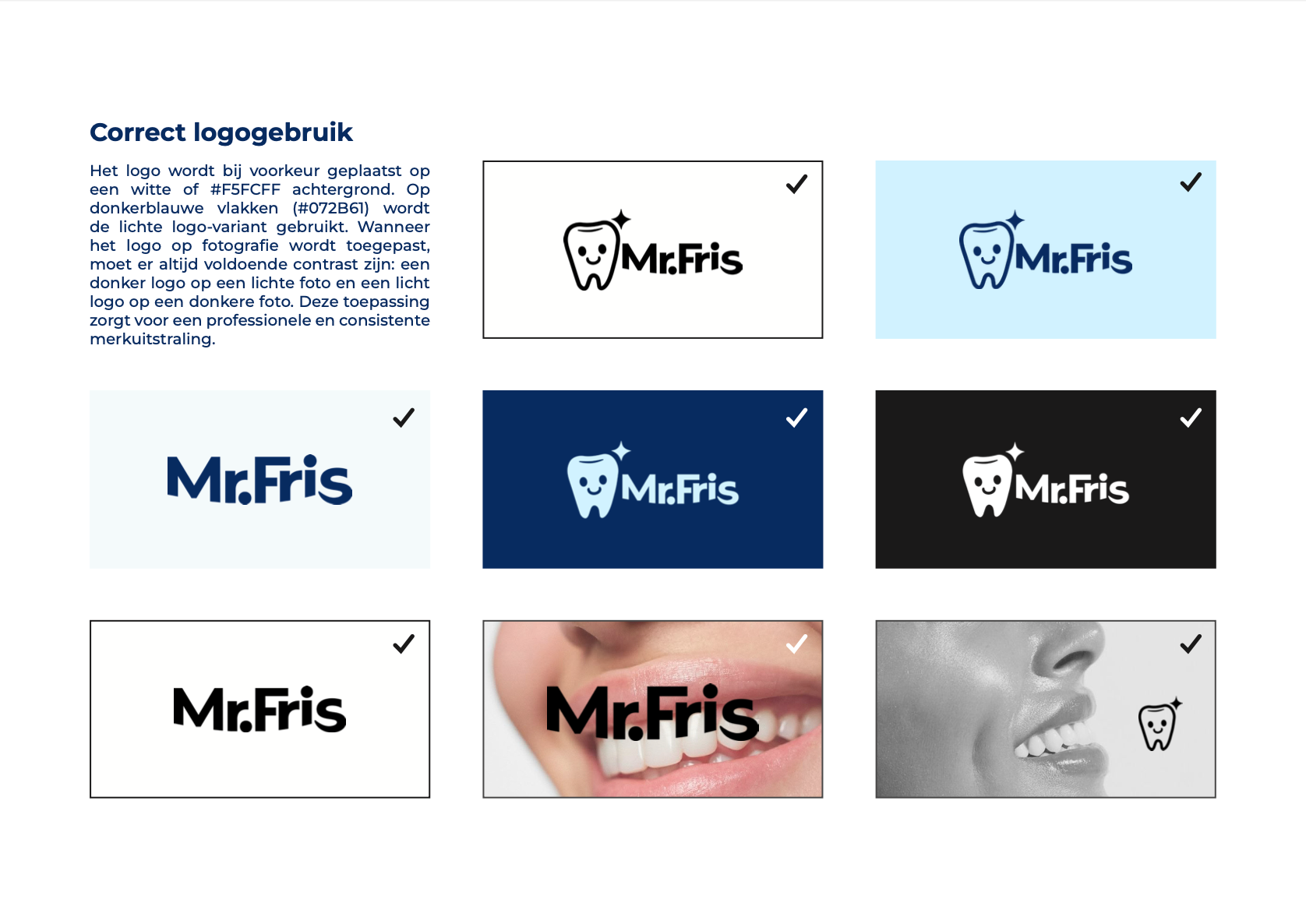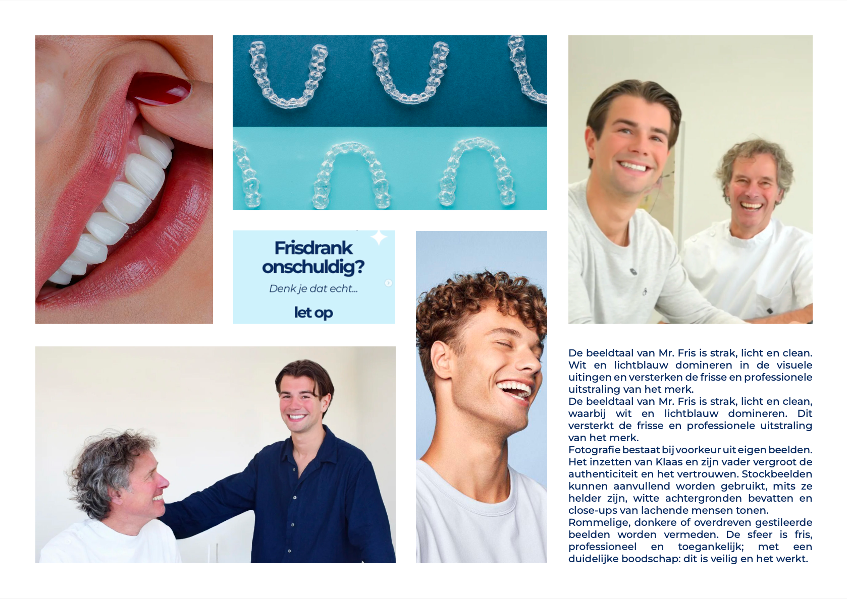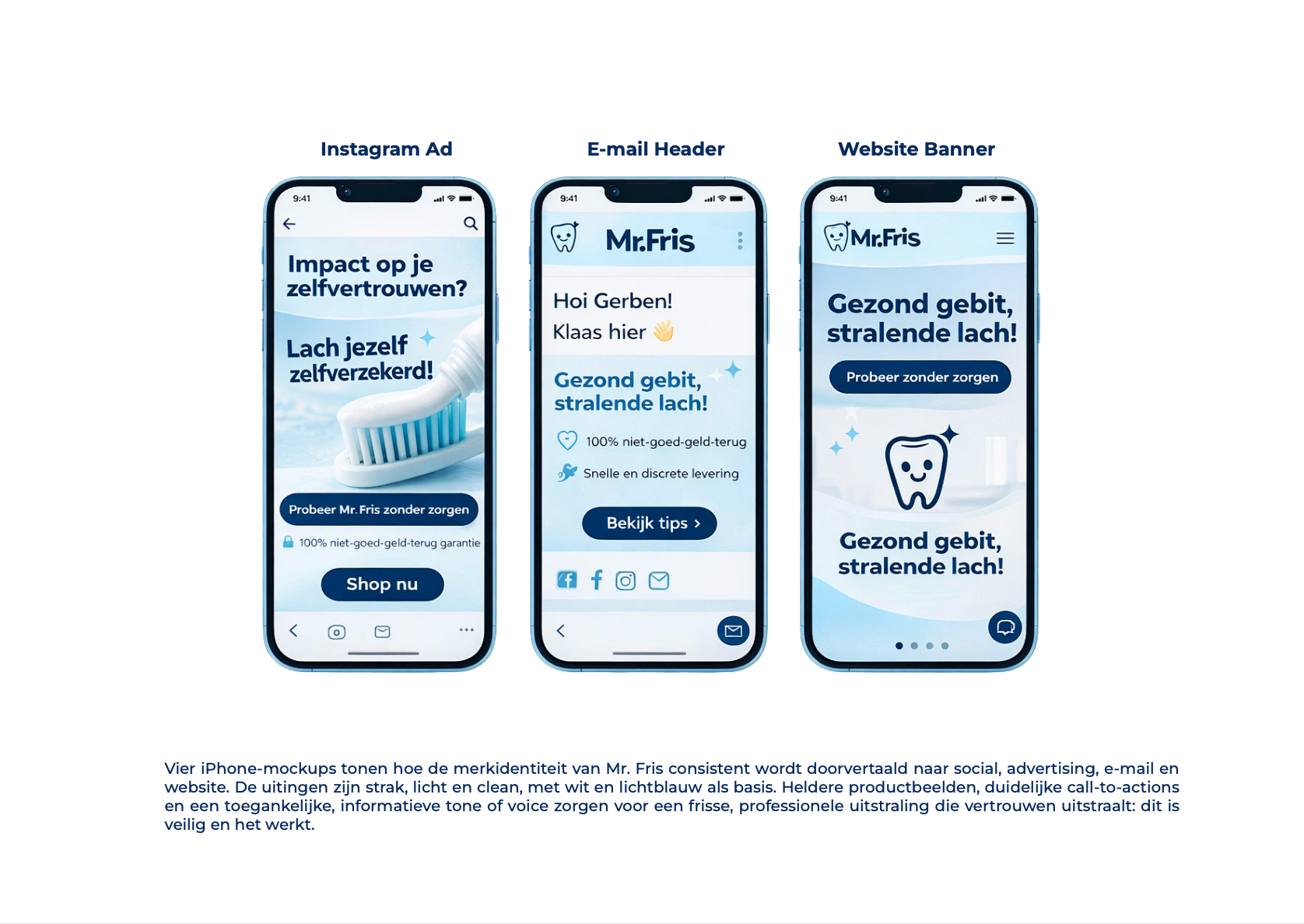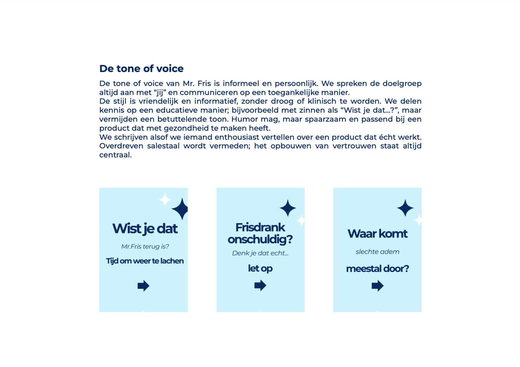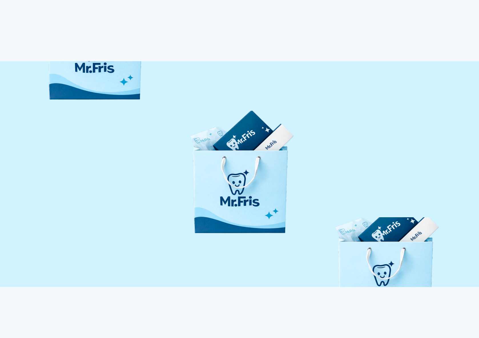 By combining a clean visual language with an approachable and informative tone of voice, the guidelines position Mr. Fris as a reliable and accessible alternative to expensive clinical whitening treatments. The result is a brand identity that communicates confidence, clarity, and trust; helping people feel proud of their smile.