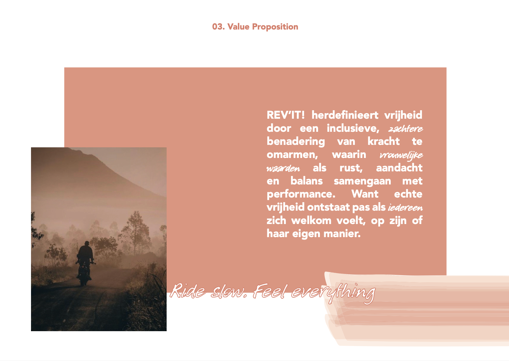 Our concept redefines freedom through a more inclusive and balanced interpretation of strength. By integrating traditionally feminine values such as calm, care, and attention alongside performance, REV’IT! becomes a brand where freedom is not about dominance, but about feeling welcome and empowered, on your own terms.